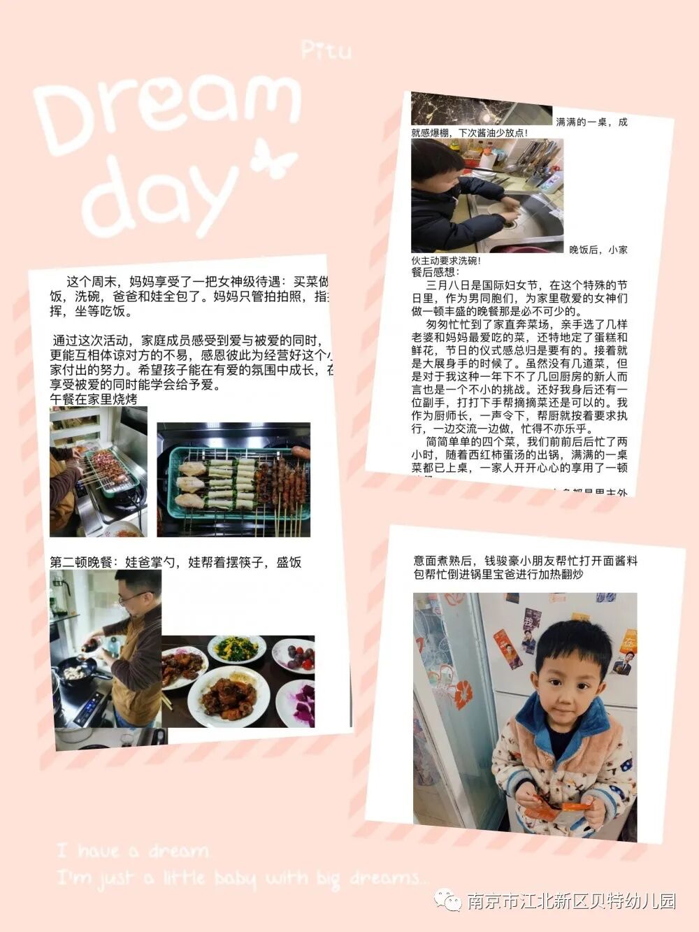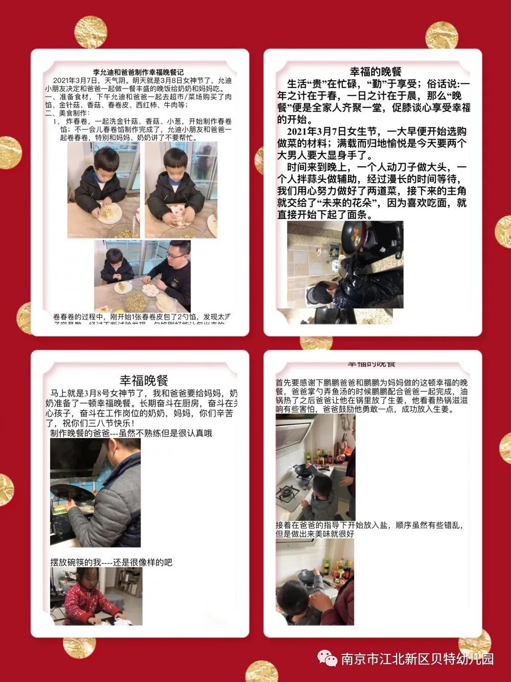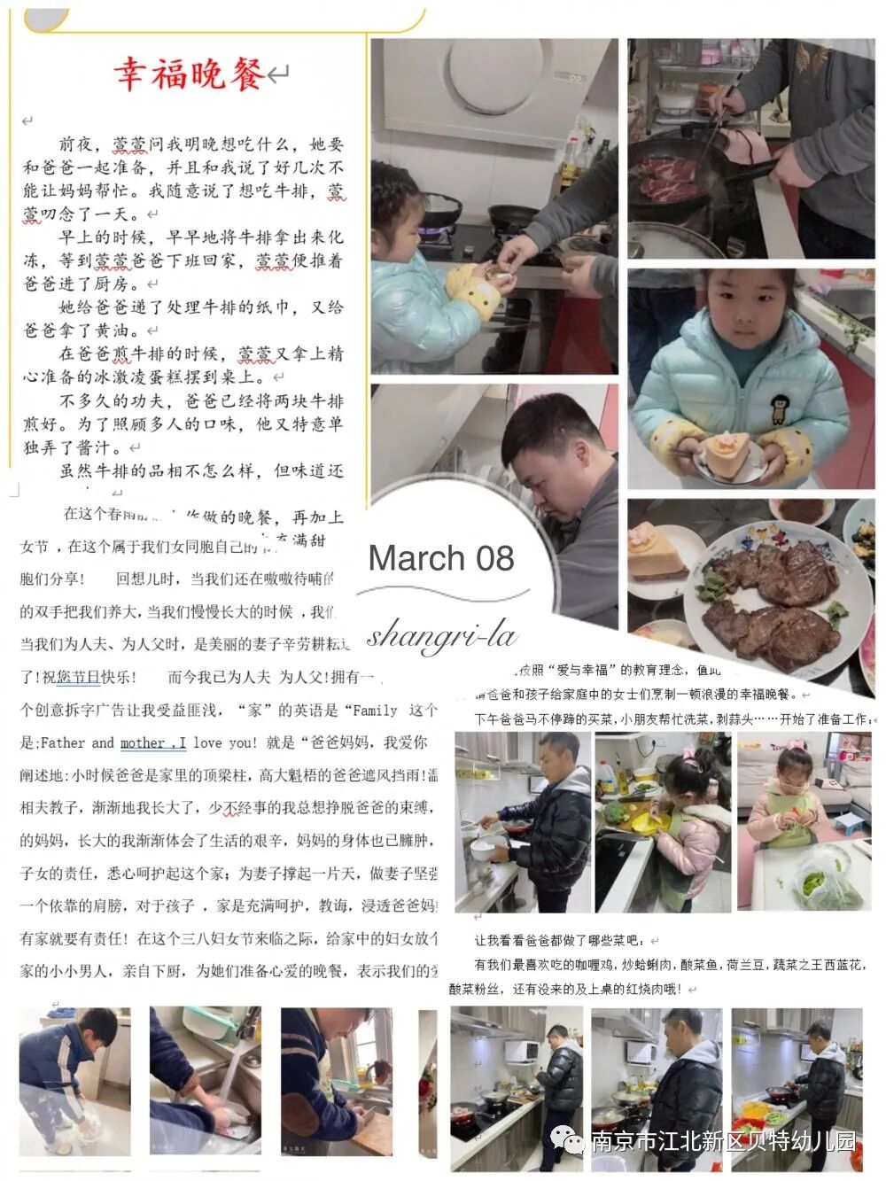 贝特幼儿园按照“爱与幸福”的国际最新幼教理念设计,开展情商培养教育,力求给予幼儿一个美丽的起点,从关注生命的幸福源动力开始,追求爱和幸福的成长教育。值此“三八国际妇女节”节日之际,请爸爸们积极配合和孩子一起,给家庭中女士们放假,自己动手烹制一顿浪漫的幸福晚餐,和家中的“女神”共享“幸福晚餐”,为教育孩子学会感恩创造机会。